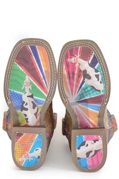 Multi-Colored Spots on Hair on Hide and Purple Crackled Spotty Western Boot with Colorful Cattle Sole.